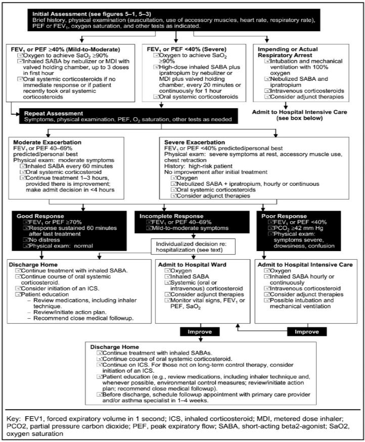 Asthma affects about 300 million people globally and over 400,000 deaths annually [1,2]. Approximately 12 million people in the United States each year experience an acute exacerbation of their asthma. Acute asthma should be differentiated from poor asthma control. In acute asthma, patients will exhibit increasing shortness of breath, chest tightness, coughing, and/or wheezing. In contrast, poor asthma control typically presents with a diurnal variability in airflow and is a characteristic that is usually not seen during an acute exacerbation [3]. Various clinical signs and symptoms may assist the clinician in determining the severity of acute asthma. For example, audible wheezing is usually a sign of moderate asthma, whereas no wheezing can be a sign of severe airflow obstruction. Major risk factors for near-fatal and fatal asthma should be recognized, and their presence makes early recognition and treatment of an asthma exacerbation essential. The history should include a review of comorbidities; adherence and proper use of medications, particularly proper technique in use of metered-dose inhalers; previous episodes of near-fatal asthma; and whether the patient has experienced multiple emergency room visits or hospitalizations, particularly those requiring admission to an intensive care unit, involving respiratory failure, intubation and mechanical ventilation [3,10]. Patient education is important to ensure that the patient understands that asthma is mostly a chronic disease and necessitates the avoidance of allergens, prevention of infections, adherence with routine vaccinations, management of comorbid conditions and adherence to treatment regimens. An individual management plan should include how to recognize an impending exacerbation and provide an incremental therapy regimen to be implemented according to the degree of severity and when to seek medical care. Additionally, social factors and psychiatric disorders need to be appropriately treated because each can affect access to care, adherence, and lead to other comorbid conditions [3,23]. This article is a structured review of the available literature regarding the diagnosis and management of acute asthma.