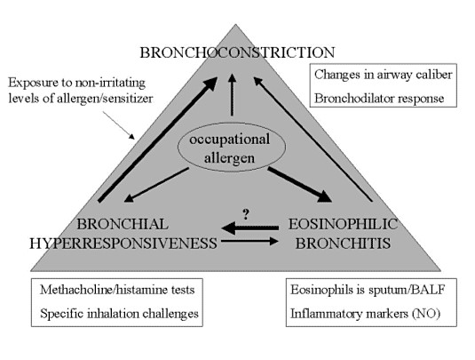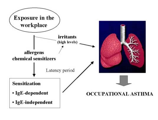 Figure 1. Evaluation of the worker with suspected occupational asthma should consider the type of exposure (allergens, chemical sensitizers, irritants) since exposure to these agents very often determines the type of asthma.