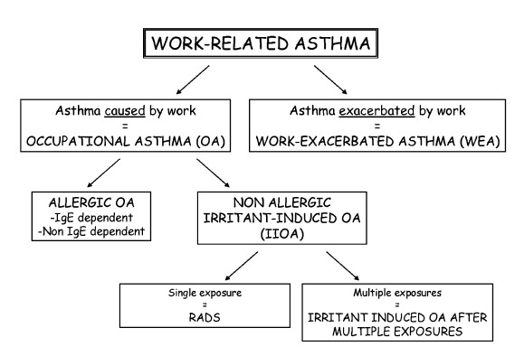 2. Irritant-induced OA (IIOA) (or “non-immunologic/non-allergic OA”) is a form of OA characterized by the development of asthma (or the reactivation of quiescent asthma) caused by exposure to irritant substances at the workplace that are capable of inducing an inflammatory reaction of the airways and non-specific bronchial hyperresponsiveness (NSBH) through non-sensitizing mechanisms. There are two subtypes; the “acute irritant-induced OA”, or “Reactive Airways Dysfunction Syndrome” (RADS) (8) characterized by the onset of asthma symptoms within 24 hours after a single, most often accidental, high-level exposure to a wide variety of irritant substances in subjects without pre-existing asthma; and “sub-acute irritant-induced OA” (9) in this case asthma develops, often more insidiously, in subjects with a history of multiple symptomatic high-level/moderate exposures. The causal relationship between exposure to irritants at the workplace and the inception of asthma can be documented with a reasonable level of confidence for asthma resulting from a single high-level or multiple exposures to irritants.