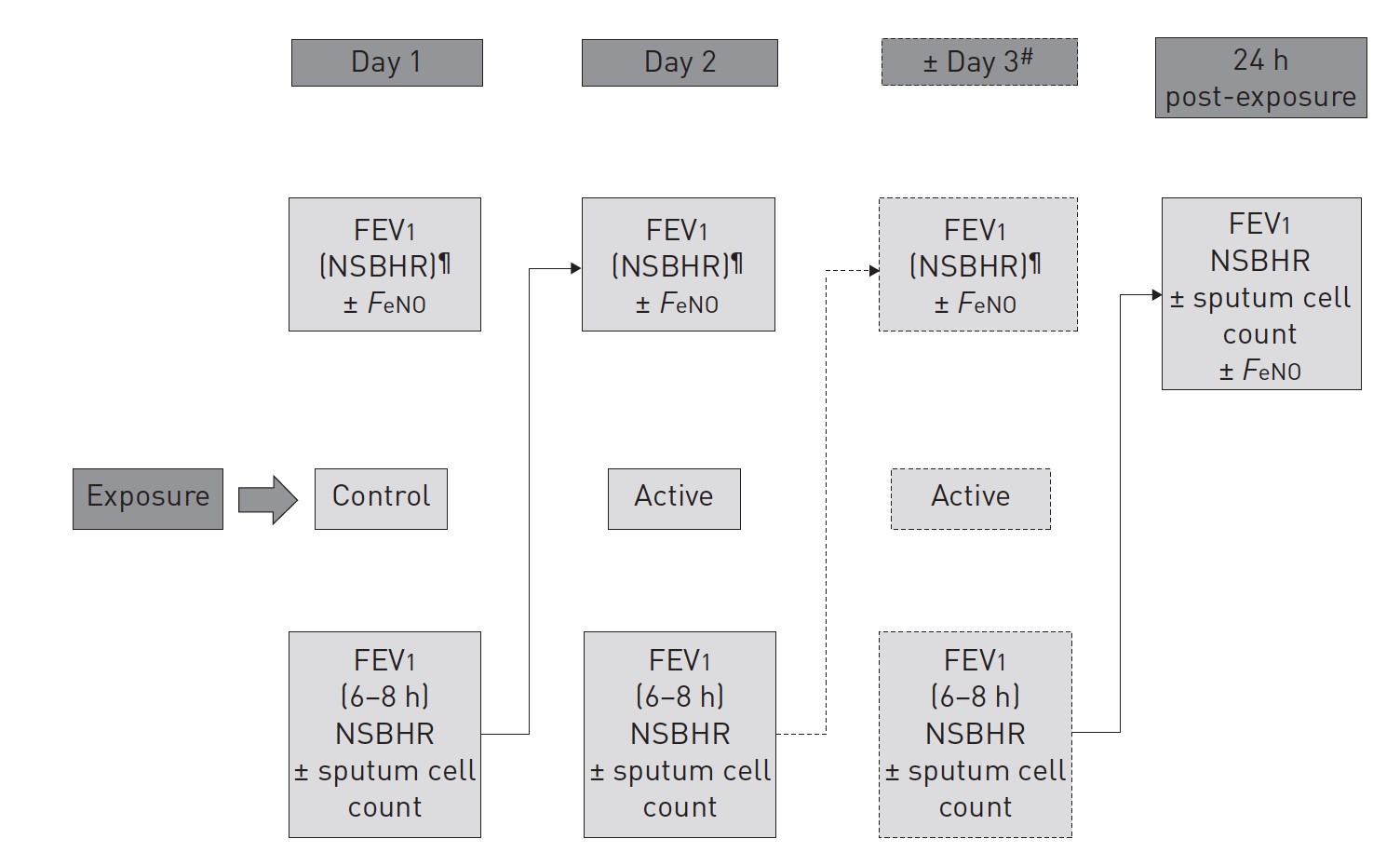 Figure 4. Schematic flow chart for performing specific inhalation challenge with an occupational agent. The timing of some measurements varies between centres. FEV1: forced expiratory volume in 1 s; NSBHR: nonspecific bronchial hyperresponsiveness; FeNO: exhaled nitric oxide fraction. #: proceed to additional active challenge(s) when the changes inFEV1 on day 2 are equivocal or negative and challenge with a higher dose is considered appropriate, or when there is a significant increase in sputum eosinophils or in FeNO post-day 2 challenge. ": NSBHR can be measured in the morning before the control and active challenge exposures provided that no inhaled bronchodilator is administered. (38)