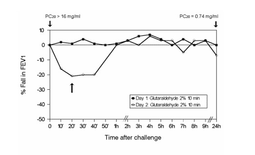 Figure 5. SIC to glutaraldehyde on test day 1 did not induce significant changes in FEV1, but methacholine inhalation test became positive (PC20 0.74 mg/ml). Re-exposure to glutaraldehyde on test day 2 elicited an immediate asthmatic response. Arrow: salbutamol inhalation (32).