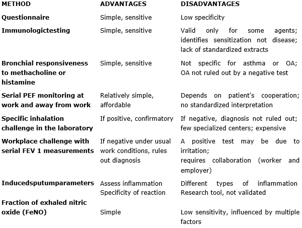 The clinical history is a key element of the investigation of OA, and it usually provides crucial information on the diagnosis of asthma and the likelihood of its work-relatedness. Moreover, the clinical history provides a rational basis for the selection and timing of additional diagnostic procedures (16). Several important questions should be included in the history, such as: circumstances of the onset of asthma symptoms, severity and persistence of asthma, the temporal relationships between exposures at work and disease exacerbation, the clinical course of asthma, as well as known triggers and intercurrent factors.