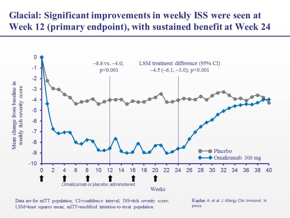 Figure - Symptom score demonstrating response to 300 mg Omalizumab vs placebo during a 6 month trial.